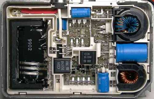 Pohled do zdrojové části, zde se vyrábí jak startovací napětí 30kV tak
