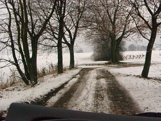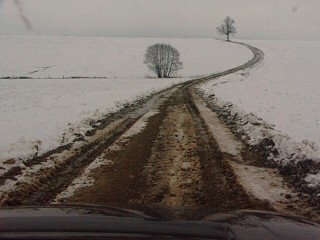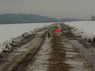 ...po které se nemělo jet, protože končí ve vratech!!! Když jsem viděl ty vrata, tak jsem myslel, že navigátora uškrtím. Už jsem se viděl, jak couvám tři kilometry zpátky. Silnice rozhodně nebyla široká, takže o otáčení nemohla být ani řeč, okolo pole pod sněhem a vrata zamčený. Vystoupili jsme, po vykonání tělesné potřeby a obhlídce terénu jsme se rozhodli nacouvat do pole a otočit se. Kvalitní zimní gumy nezklamaly, trochu jsem si hrábnul, ale vyjel, navigátor ani nemusel tlačit. Chvíli jsem koketoval s myšlenkou, že bych mu ujel, ale to bych si pak musel navigovat sám a to se mi nechtělo. Cestou zpátky s námi začal závodit zajíc. Běžel pořád před námi a zdržoval. Vydržel až do 40km/h, pak se začal unavovat a nakonec odbočil do pole a tak zvítězil, v poli bych mu nestačil, měl lepší obutí...