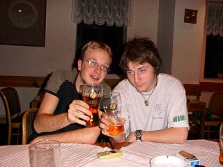 Alkoholici v cíli: Vítek & Kuba V pokročilé noční hodině jsme se odebrali ke spánku. Pokoj byl vybaven akumulačními kamny. Akumulační kamna jsou akumulační od toho, aby v noci, kdy je menší odběr el. energie, akumulovala a přes den topila. Naše akumulační kamna tento princip zřejmě neznala a tak topila v jednom kuse naplno, bez sebemenší možnosti regulace. Regulátor kombinovaný s vypínačem nereagoval na naše pokyny, a tak jsme museli přistoupit na jiný způsob regulace. A to regulaci otevřeným oknem. Otevřené okno ovšem vydávalo neuvěřitelnou zimu, což byl přesný protiklad rozžhavených kamen. Podařilo se nám nastavit speciální konfiguraci oken a ventilaček tak, aby teplota v místnosti byla přijatelná. Díky otevřenému oknu jsme také mohli lépe slyšet bernardýna, který venku štěkal a vyl celou noc... Autor článku: BigBen (Ben Rothbauer)