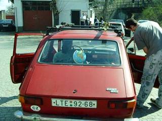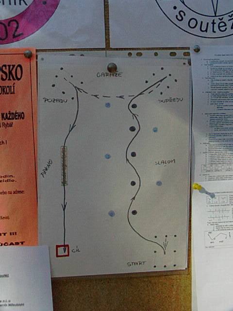 S Markem a jeho navigátorkou jsme se potkali na výpadovce z Prahy - u Agipu. Další sraz byl na 8. km dálnice směr Teplice, tam měl čekat Honza. Chybička se vloudila, Marek se se svým Rapidem tak rozjel, že jsme mu s Feldou málem nestačili. Vítek chtěl pořád řadit 6. rychlostní stupeň, ale nemohl ho najít. Rapid předjíždí všechno, co se dá... Poznámka pro Dana: Dane, kliknutím na obrázek se ti zvětší. - Ten obrázek, samozřejmě. Honza vyhlížel na 8. km dálnice zeleného Rapida a modrou Feldu. Klamání nepřítele se podařilo, zelený Rapid se sice kolem přehnal, ale Felda byla červená a zastavili se až na 18. km dálnice. Honza byl zmaten, ke šťastnému shledání nám pomohly mobilní telefony. Start byl v Roudnici nad Labem, díky mojí bravurní navigaci jsme ho našli bez problémů. Naši kolegové - Trabantisti - nás už vyhlíželi, ale nepoznali nás! Zmátli jsme je barvou svého vozu. Chachacha. Na startu bylo 28 posádek s automobily všech možných značek. Někteří měli speciální vybavení, aby nezabloudili kolem zeměkoule... Poznámka pro Dana: Dane, i tento obrázek se ti zvětší po kliknutí na něj. Itinerář byl psán trochu netradičním způsobem. První věta: "Na hlavní silnici nejprve splň soutěžní úkol č.1 a pak nejezdi z kopce." Mne nejdříve jako navigátora trochu zmátla, zvláště, když soutěžní úkol č.1 zněl: Kolik stojí nafta? Ze startu jsme tedy vyjeli jedinou možnou cestou až na hlavní, tam jsme potkali benzínovou pumpu a tím i pochopili soutěžní úkol. Pak už jen zbývalo nejezdit z kopce... Většina trasy vedla po Roudnici a okolí a myslím že byla dobře vybraná. Navigačně mi nejvíce dala zabrat část itineráře, kde jsem musel vynášet do mapy jednotlivé body zadané pomocí azimutů. Bylo mi divné proč na startu rozdávají úhloměry, tak jsem si jeden vzal, teď jsem ho poprvé za 2 roky ježdění AOSu potřeboval. Voda poblíž silnice? Proč jsem si vzpomněl na to, jak jsme málem skočili loni do rybníka...? Poznámka pro Dana: Dane? Tvoje předstartovní poznámky o rybnících na trati byly velmi nevhodné... Největší sranda byla část itineráře, která byla ve formě fotografií. Podle těchto fotek jsme měli sledovat modrou dodávku. Vítek jezdil ovšem moc rychle, takže jsem chvílemi nestíhal přehodnocovat, zda ta ulice na fotce je opravdu ta ulice před námi. Na trase jsme dojeli kolegy s vytuněnou škodárnou, stejně jako my zastavili v jedné vesničce, aby se poradili nad mapou. V tu chvíli se seběhla místní mládež, kde jejich věk zcela určitě dosahoval hodnot menších než 12. A zahrnuli tuto škodárnu obdivnými komentáři vy stylu: "Ty píčo! Ty krávo! Ty mr...! To je bomba, čum na ty kola..." Náctiletí byli unešeni touto škodárnou - fakt nebyla špatná. Poznámka pro Dana: Jestli jí chceš vidět větší, tak na ten obrázek klikni myší. Bohužel závod měl i malou černou tečku, o kterou se postaral jeden samozvaný strážce pořádku v obci Dušníky, kterou se již tradičně projíždí. Zaparkoval svojí Felicii tak, aby schválně blokoval průjezd. Tím posádkám, které jely v druhé části startovního pole, zkomplikoval plnění jednoho soutěžního úkolu a orientaci v itineráři, protože bylo nutno volit náhradní trasu. Pokoušel jsem se s tímto člověkem diskutovat, ale jeho IQ to zjevně neumožňovalo. To je on! Škoda, že odlesk slunce způsobil jen částečnou čitelnost SPZ a on před foťákem utekl. Poznámka pro Dana: Můžeš si to zvětšit. Hádej jak. Při jízdě zručnosti jsem si já pako blbě najel a při couvání do garáže shodil jednu tyčku. Tím jsme získali zbytečné trestné body a obsadili tak 9.-12. místo, čtyři posádky měly stejný čas - to jsem ještě neviděl. Plánek jízdy zručnosti. Poznámka pro Dana: Když si ten obrázek zvětšíš, tak pořád nedosáhneš reálné velikosti té jízdy zručnosti. Do cíle jsme dojeli všichni v pohodě a zdrávi. Cílem i startem byla restaurace "Na rejdišti", kde jsme s Vítkem vymlaskli pivo a svíčkovou se šesti. Marek se svojí navigátorkou při jejich prvním závodě excelovali, protože byli LEPŠÍ!!! než my, co už jezdíme druhým rokem. GRATULUJEME!!! Zleva: Marek, Vítek, Marek s Gábinou (to je ta blond, co umí navigovat), Honza s Luckou. Zády sedí Dan a u foťáku Ben. Poznámka pro Dana: Dane, fotku si můžeš zvětšit, ale sebe neuvidíš, protože sedíš zády k fotografovi, to jsem já, takže mě taky neuvidíš. Osoby, obsazení a umístění: 2. místo - Marek a Dan - Trabant Combi 7. místo - Marek a Gábina - Škoda 130 Rapid 8. místo - Ben a Vítek - Škoda Felicia 15. místo - Honza a Lucka - Škoda 120 Ohlasy v cíli: Někteří jedinci se divili jak to, že nás Marek s Gábinou předjeli, že? Já na tom nevidím nic divnýho, prostě jsem jim dobře vysvětlil pravidla. Dan měl nějaké poznámky na moji adresu ohledně mých reportáží ze závodů. PRÝ TAM DÁVÁM MOC MALÝ FOTKY!!! No, doufám, že po dnešku už Dan s fotkama nebude mít problém. Autor článku: BigBen (Ben Rothbauer)