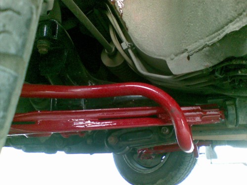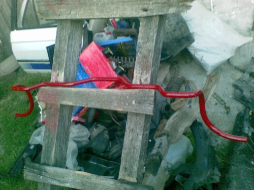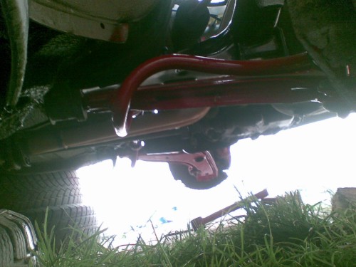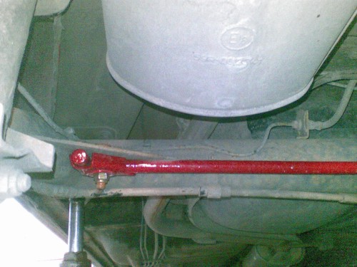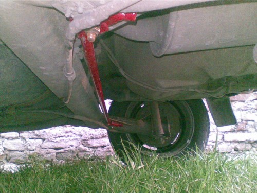 Po tomto som mal nachystaný ešte aj zadný stabilizátor, montáž je jednoduchá na pôvodnú nápravu, niektoré posledné modely Favoritov mali vo výstuhe zadnej nápravy dieru na uchytenie od výroby, ja som ich musel navŕtať, uchytenie pomocou originálnych príložiek pevnostnými skrutkami 10x65x1,25 so samozaisťoacími maticami.