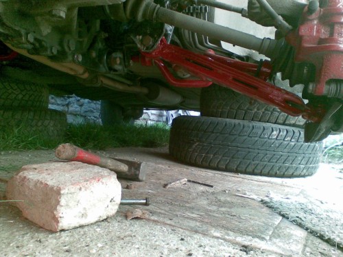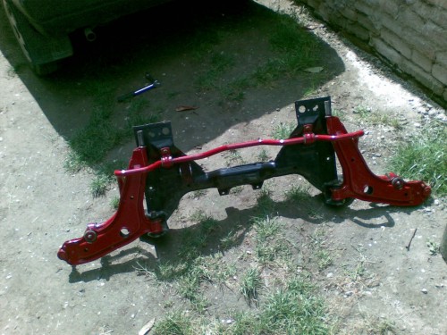 Samotné nasadenie nápravy do auta bolo v pohode, akurát si treba zohnať iné skrutky na predný úchyt do nosníka, je tam 10x65x1,25, takže pevnostné skrutky s jemným stúpaním, inak také isté ako držia tlmič v objímke tehlice, náprava sa nasadí, vycentruje sa pomocou tých otvorov a potom sa môže zatiahnuť na pevno. Ďalšie rozdiely sú oproti Favoritu, riadenie nie je uchytené 4ks 8x30, ale 4ks 10x30 skrutkami, na prevodovku treba dlhšie 3ks skrutky na uchytenie konzoly, mali by tam ísť nejaké podložky, ale ja som požil 3ks 10 matky, tá konzola nemá dosadať priamo na prevodovku, ale má tam byť medzera. Vzpera prevodovky sa uchytí o nápravnicu a podložený motor sa môže uvoľniť. Nasadia sa spodné čapy do tehlice, tyč, aj pomocná tyč radenia, namontuje 1diel výfuku, krycie plechy motora. Nasadiť kola, auto spustiť a môže sa ísť na skúšobnú jazdu a odporúčal by som aj geometriu.