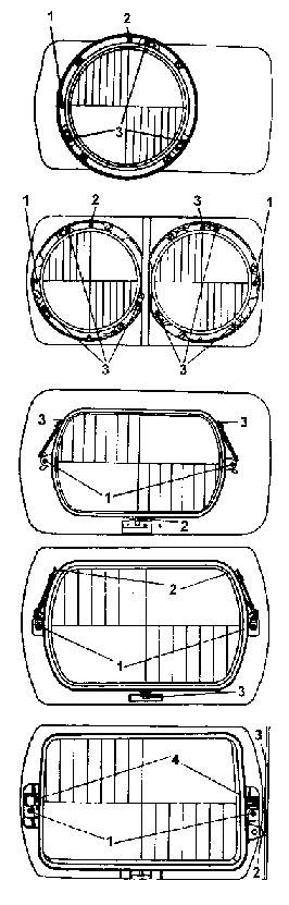 šrouby, 2- upevňvací pružiny optické vložky, 3-čep světlometu.